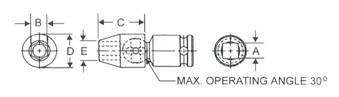 STD. TYPE | TENSION TYPE | SQUARE DRIVE (A) | HEX SIZE (B) | SOCKET LENGTH (C) | SOCKET DIAMETER (D) | NOSE DIAMETER (E) |
